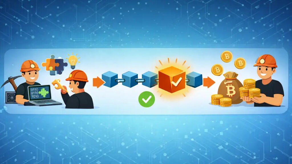 Blok ödülü almak için madencilerin, ağın zorluk seviyesine uygun yüksek işlemci gücüne sahip ekipmanlarla (örneğin ASIC cihazlar) karmaşık matematiksel problemleri çözmesi gerekir. Kriptografik bulmacayı ilk çözen madenci, çözümünü ağdaki diğer katılımcılara iletir. Çözümün doğruluğu ağı tarafından (konsensüs) onaylandığında, protokol otomatik olarak madencinin cüzdan adresine belirlenen blok ödülünü transfer eder.